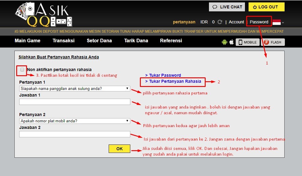 Sistem Pkv di asikqq menyediakan fitur keamanan dengan metode pertanyaan rahasia. Apa maksudnya? Seperti yang anda ketahui, jika anda ingin login kedalam akun anda. Setelah memasukan ID dan password, selanjutnya anda akan diminta untuk memasukan 3 digit nomor akhir rekening anda. Tapi jika anda mengaktifkan sistem pertanyaan rahasia. Nanti permintaan 3 digit nomor rekening akhir anda akan terganti dengan pertanyaan rahasia tersebut.